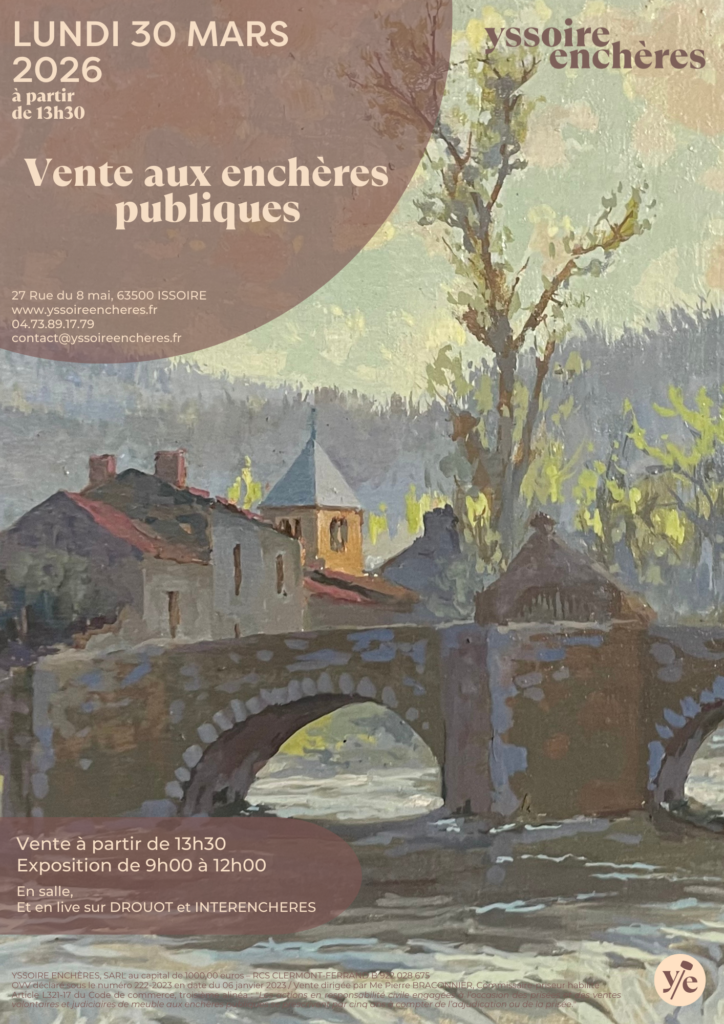 Yssoire Enchères vous accompagne et vous conseille dans un cadre professionnel et convivial pour vendre et/ou acheter à l’occasion des ventes aux enchères publiques qu’elle organise. Elle intervient également dans la réalisation d’inventaire estimatif (succession, partage, assurance, vide-maison…).
